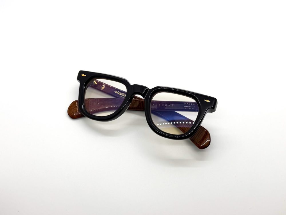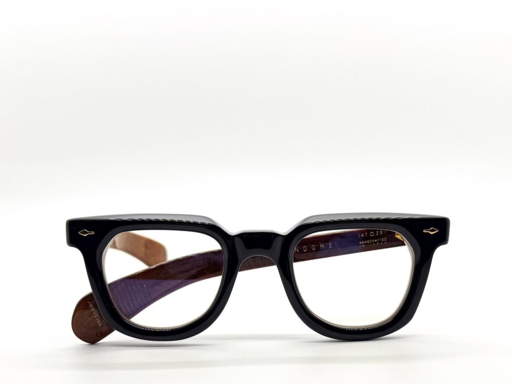表側は濃度の高い黒がビシッと効きつつ、内側にはバールウッドのようなブラウンパターンが艶やかに潜んでいます。正面からは重厚で端正なブラック、ふとテンプルの内側が覗いた瞬間にだけ木目調のあたたかさが浮かび上がる、”ラグジュアリーと渋さ”を同時に楽しめるブラックです。
