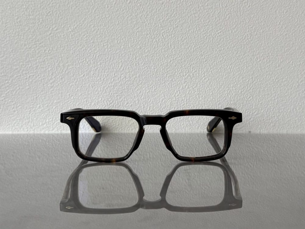 輪郭のはっきりしたレクタングルで、掛けた瞬間に目元がスッと締まり、顔が整います。